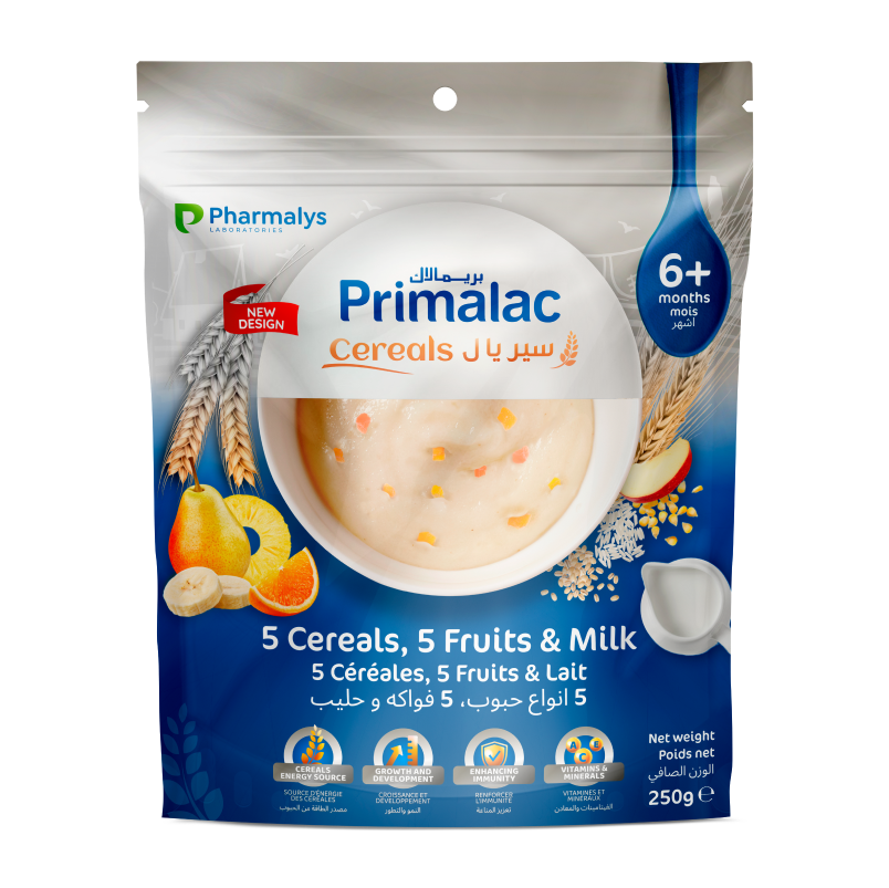 Cereals 43,2 % (Wheat flour and hydrolyzed Wheat flour, Rice flour, Corn flour, Rye flour, Barley flour), skimmed-milk powder (27,6%), Sucrose, Fruits 8% ( Banana, Orange, Apple, Pear, Pineapple), Maltodextrin, vegetable oil (contains Soya), minerals (Calcium Carbonate, Ferric Pyrophosphate, Potassium Iodide, Zinc Sulphate), vitamins (C,E, A, Niacin, D, Pantothenate, Thiamin, Biotin, B6, Folic acid, B12, K), and flavour (Vanillin)