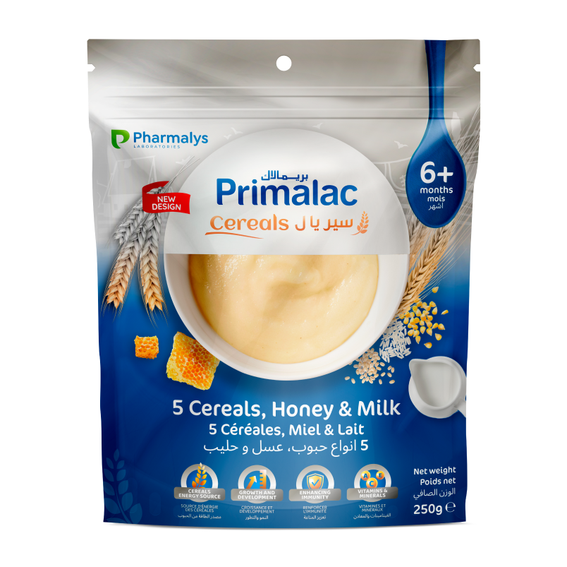 Cereals 54% (Wheat flour and hydrolyzed Wheat flour, Rice flour, Corn flour, Rye flour, Barley flour), skimmed-milk powder (28%), Dextrose, Sucrose, honey (7%), vegetable oil (contains Soya), minerals (Calcium Carbonate, Ferric Pyrophosphate, Potassium Iodide, Zinc Sulphate), vitamins (C, A, Niacin, E, D, Pantothenate, Thiamin, Biotin, B6, Folic acid, B12, K), and flavor (Vanillin)